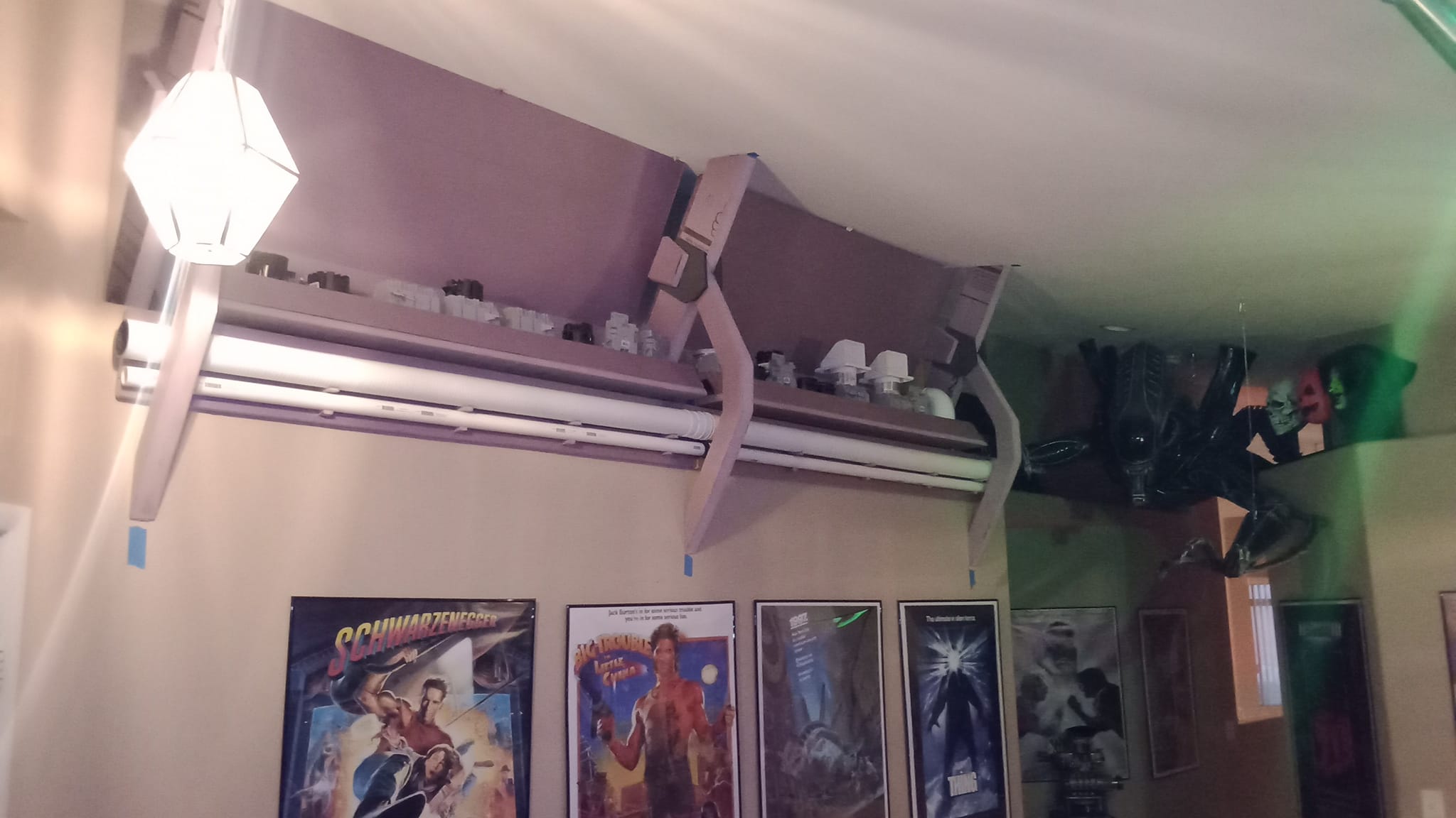 I made the shelf and everything else to have zero impact on the house itself. Nothing it's attached with anything more than thumb tacks. Even the greebles will just sit on the shelf without being attached to it.