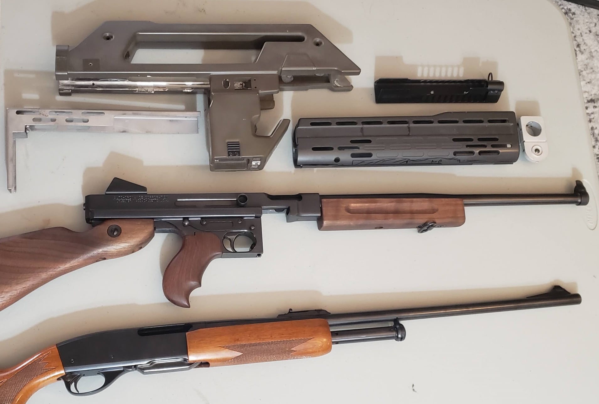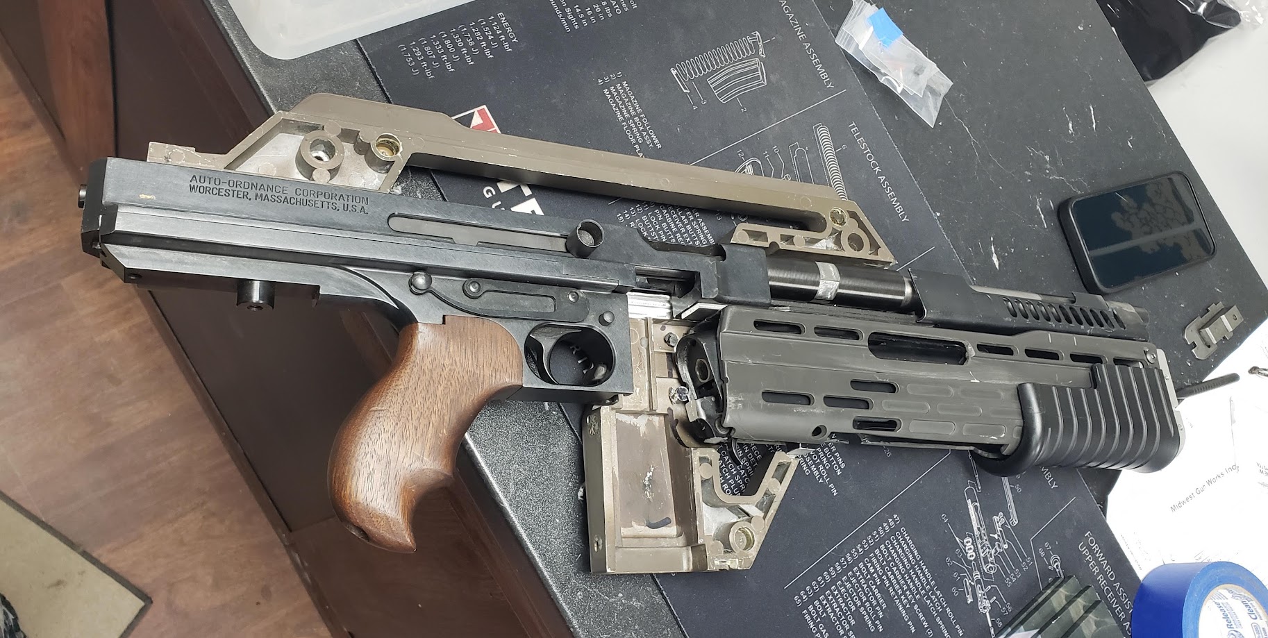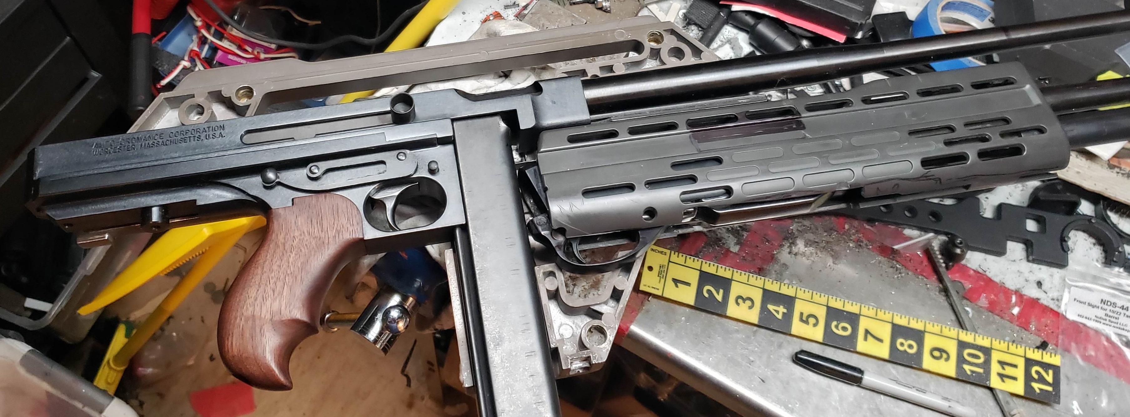 Base gun - Auto-Ordinance M1 Thompson (semiauto) with shortened barrel (Registered "Short Barreled Rifle). Only mod besides shortening the barrel was to turn down the barrel and add wrench flats for easier assembly/disassembly.