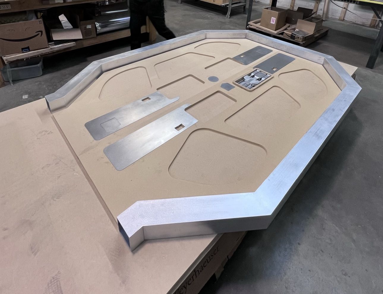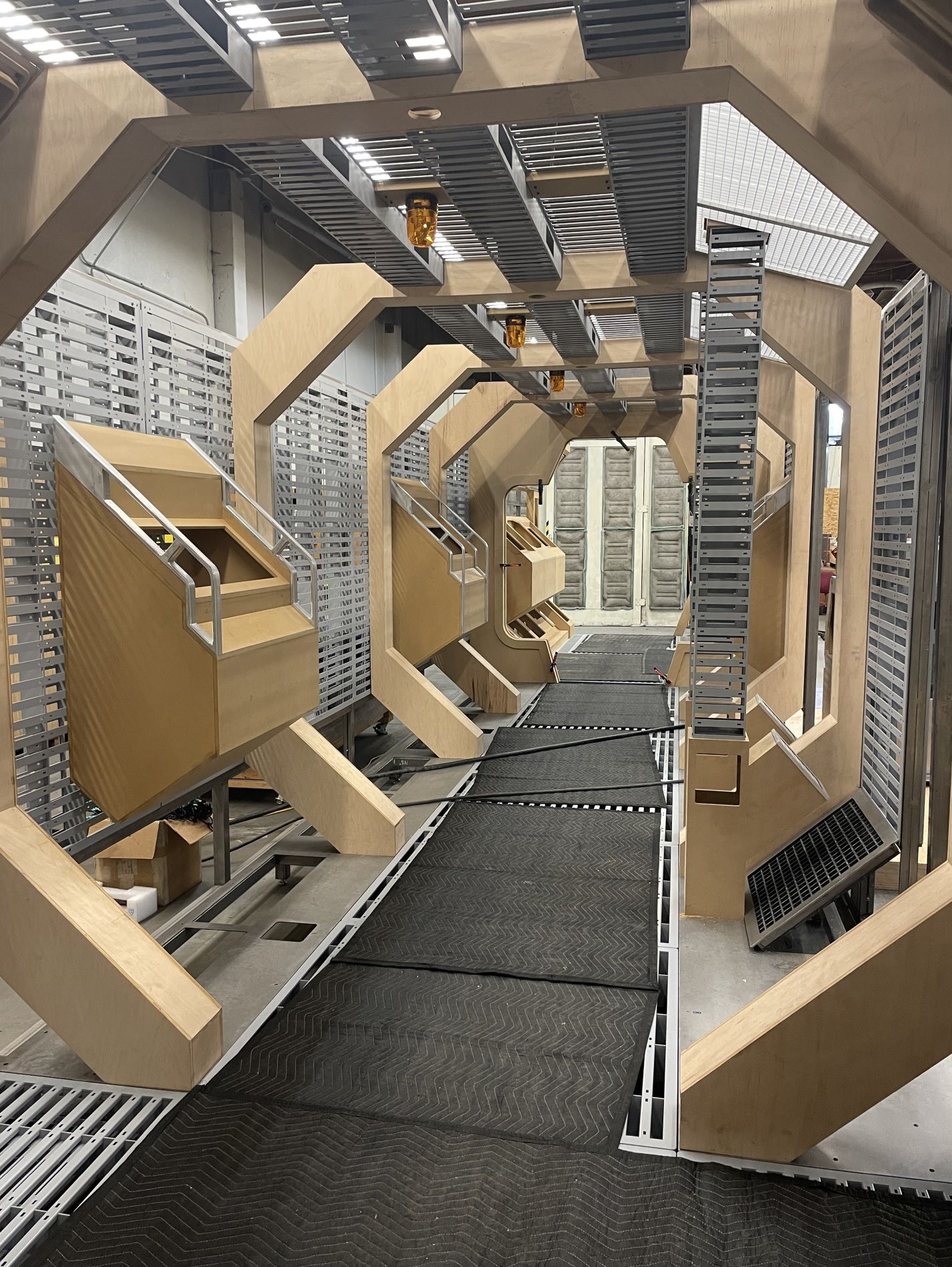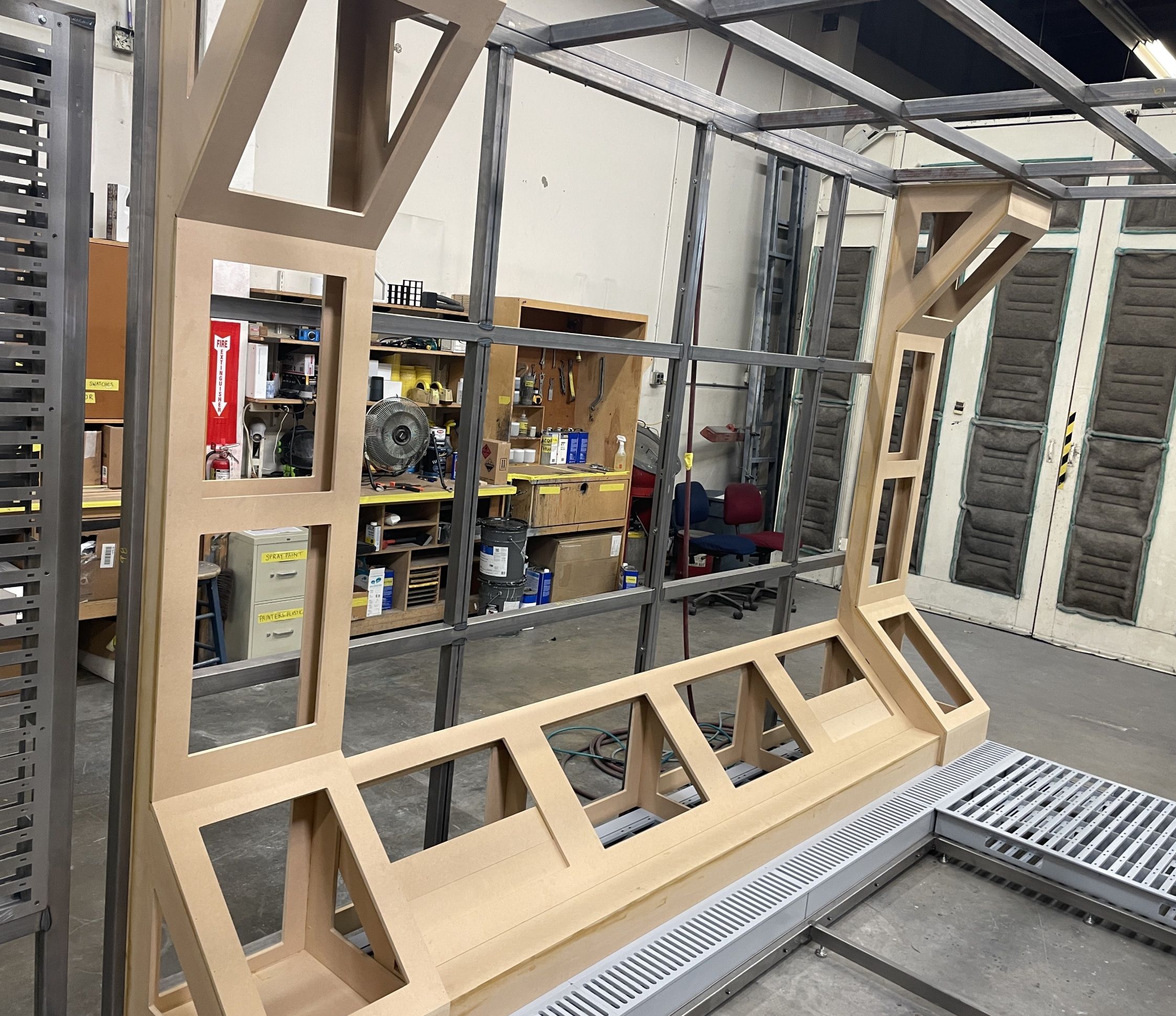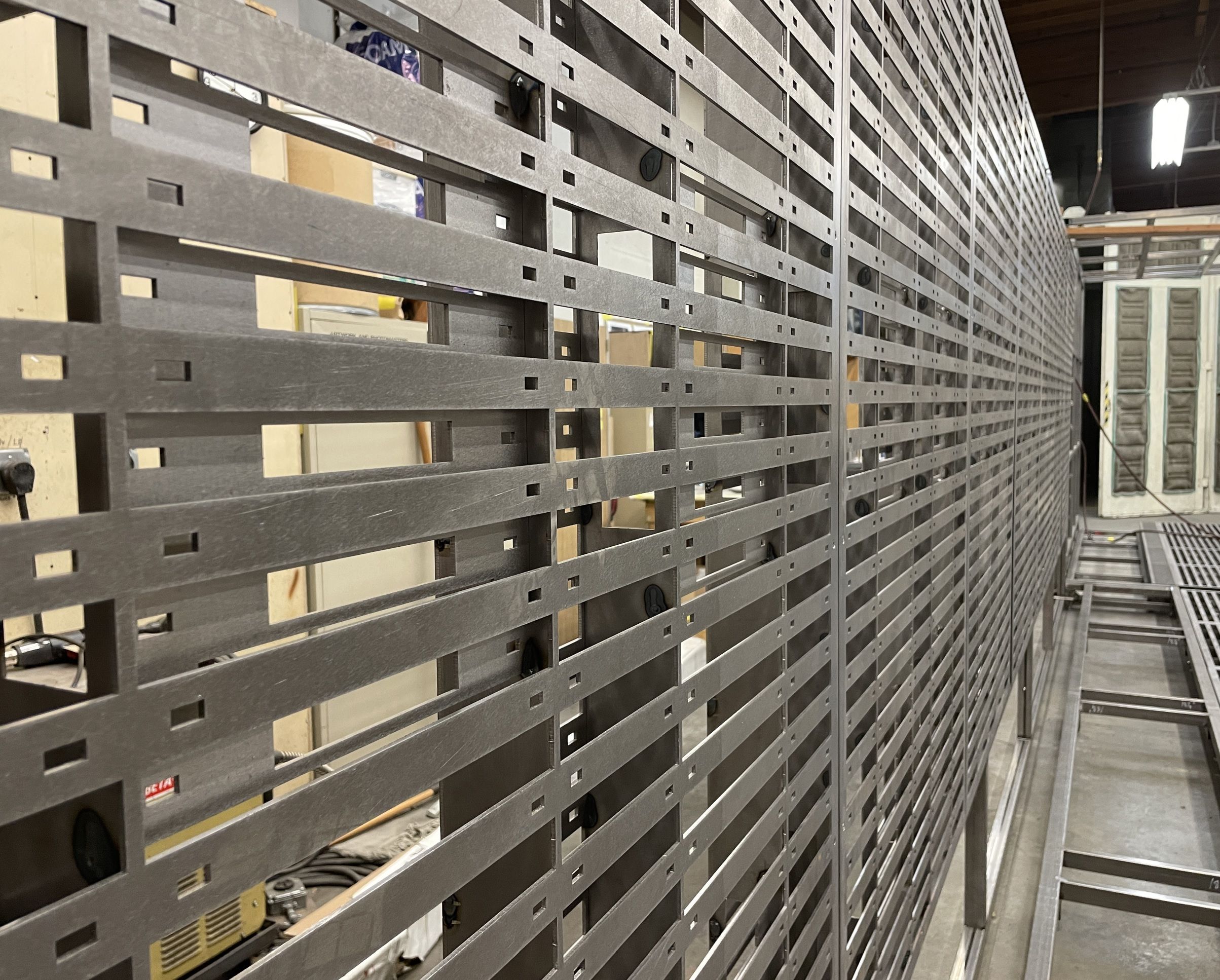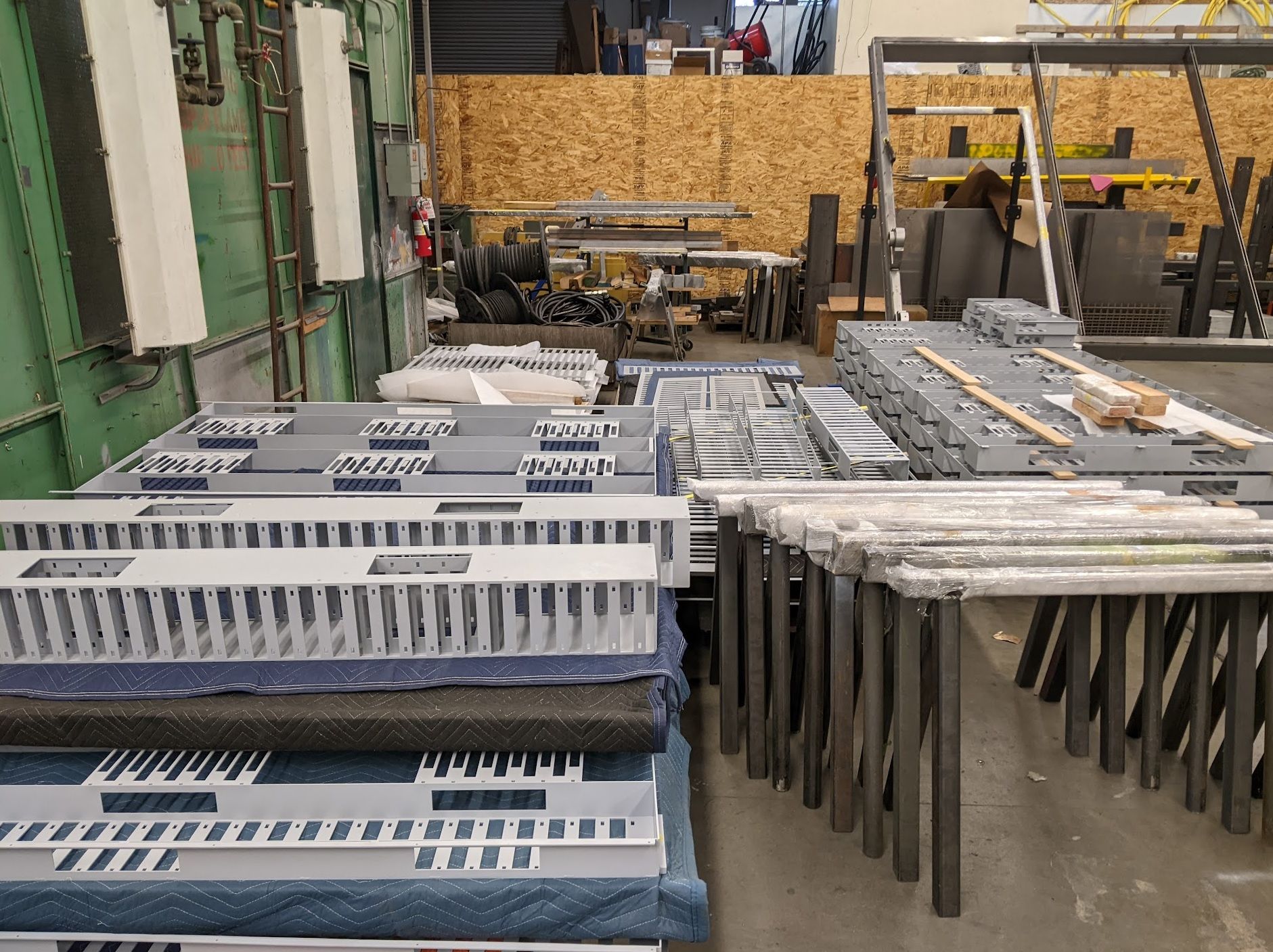 Meanwhile, we'd finished priming a whole ton of the metal wall & floor pallets. In the back, you can see a box full of cables and other junk. While we were fabricating, we were also collecting boxes of old wiring, cabling, and electronics junk. We'd be using it wherever we could later in the build to achieve our weathering and high frequency detail goals.