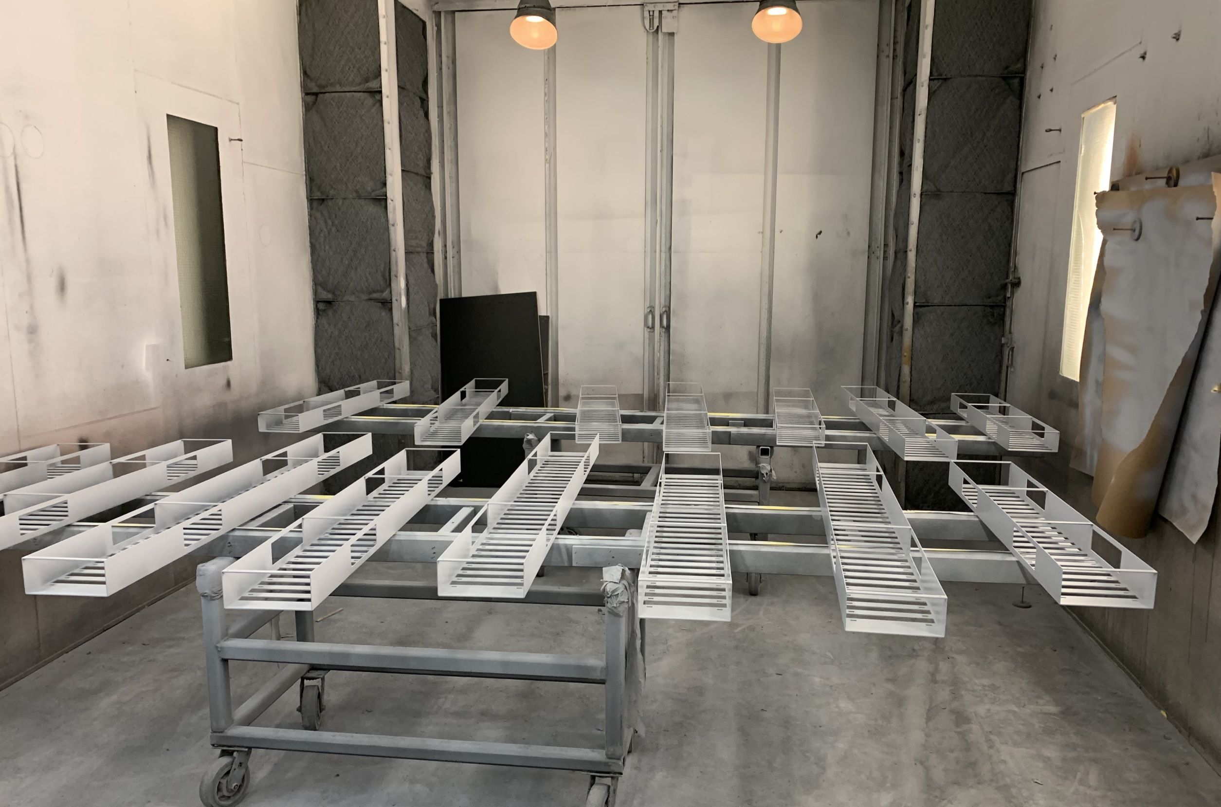 Meanwhile, we'd finished priming a whole ton of the metal wall & floor pallets. In the back, you can see a box full of cables and other junk. While we were fabricating, we were also collecting boxes of old wiring, cabling, and electronics junk. We'd be using it wherever we could later in the build to achieve our weathering and high frequency detail goals.