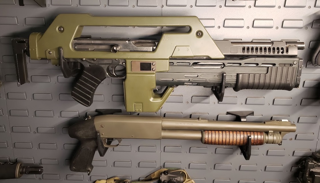 Launcher - Remington 760 in .30-06, also registered as an SBR. We went with the 760 instead of an 870 to get around prohibitions on short-barreled shotguns in Minnesota law. Added a Troy Claymore linear comp to increase the outer diameter of the barrel to closer to 12-gauge. SPAS cage is from a Tokyo Marui Airsoft, front block from SD Studios and pump from a Snow Wolf Airsoft.