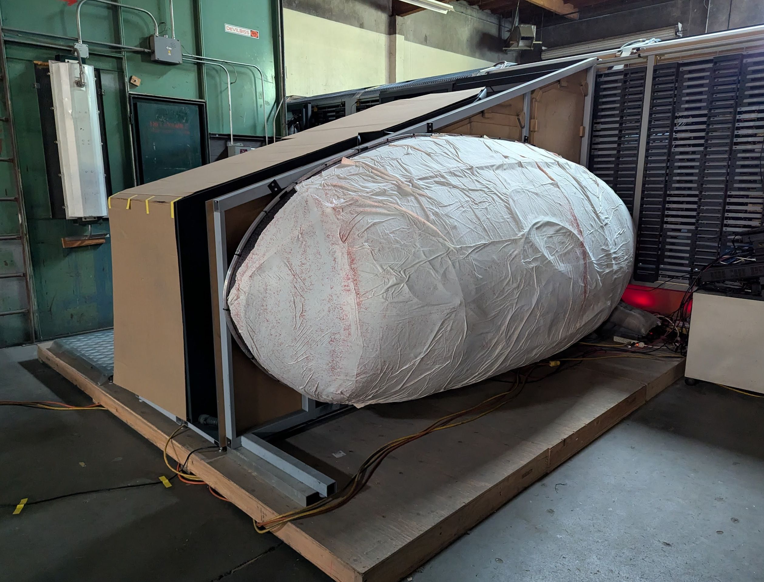 The finished space bowl from the outside, mounted over the bridge's metal window frame, with all the optic fibres under the cover that lead to the individual sparkling lights in the starfield. This will all get jammed into a very tight space in the installation.