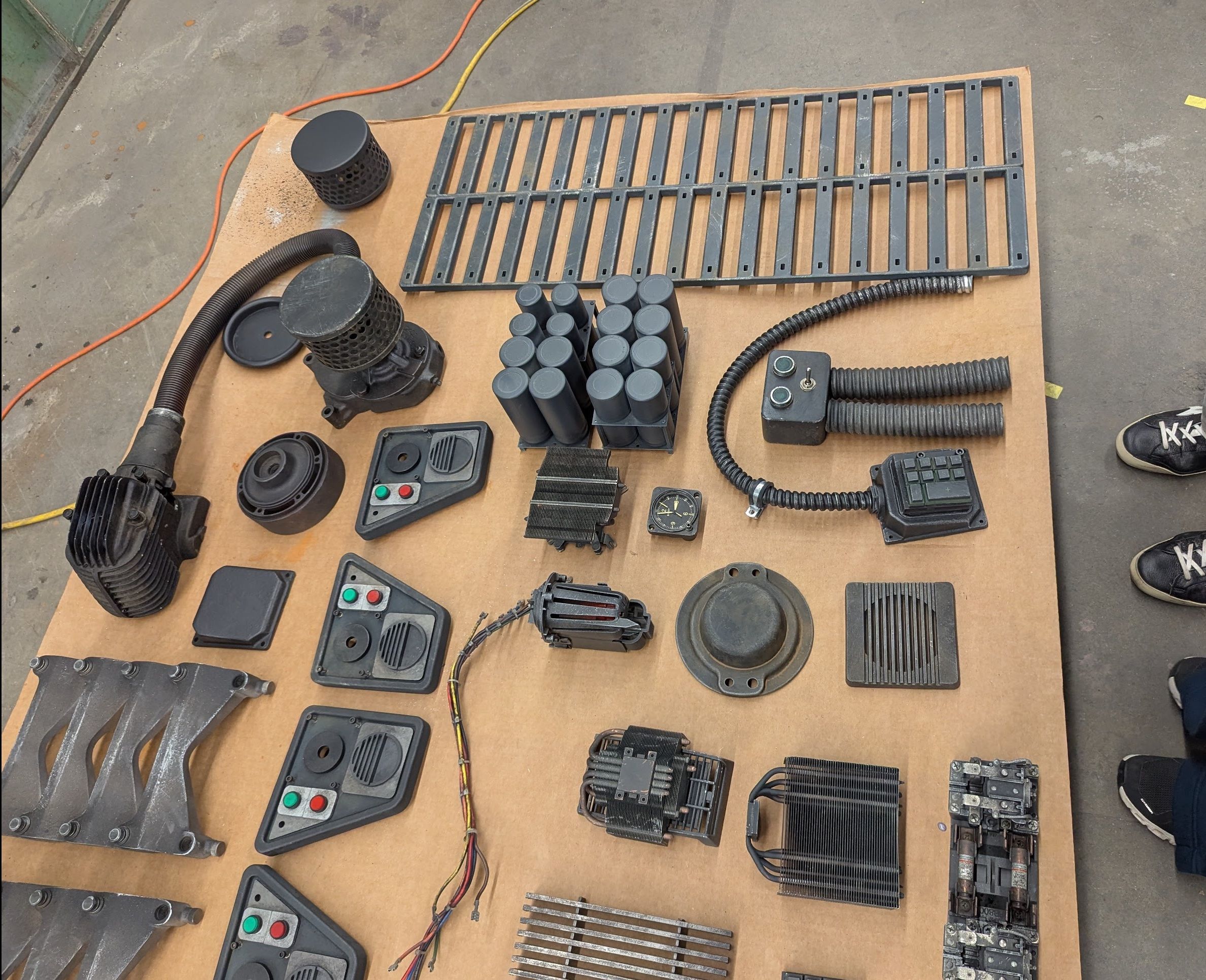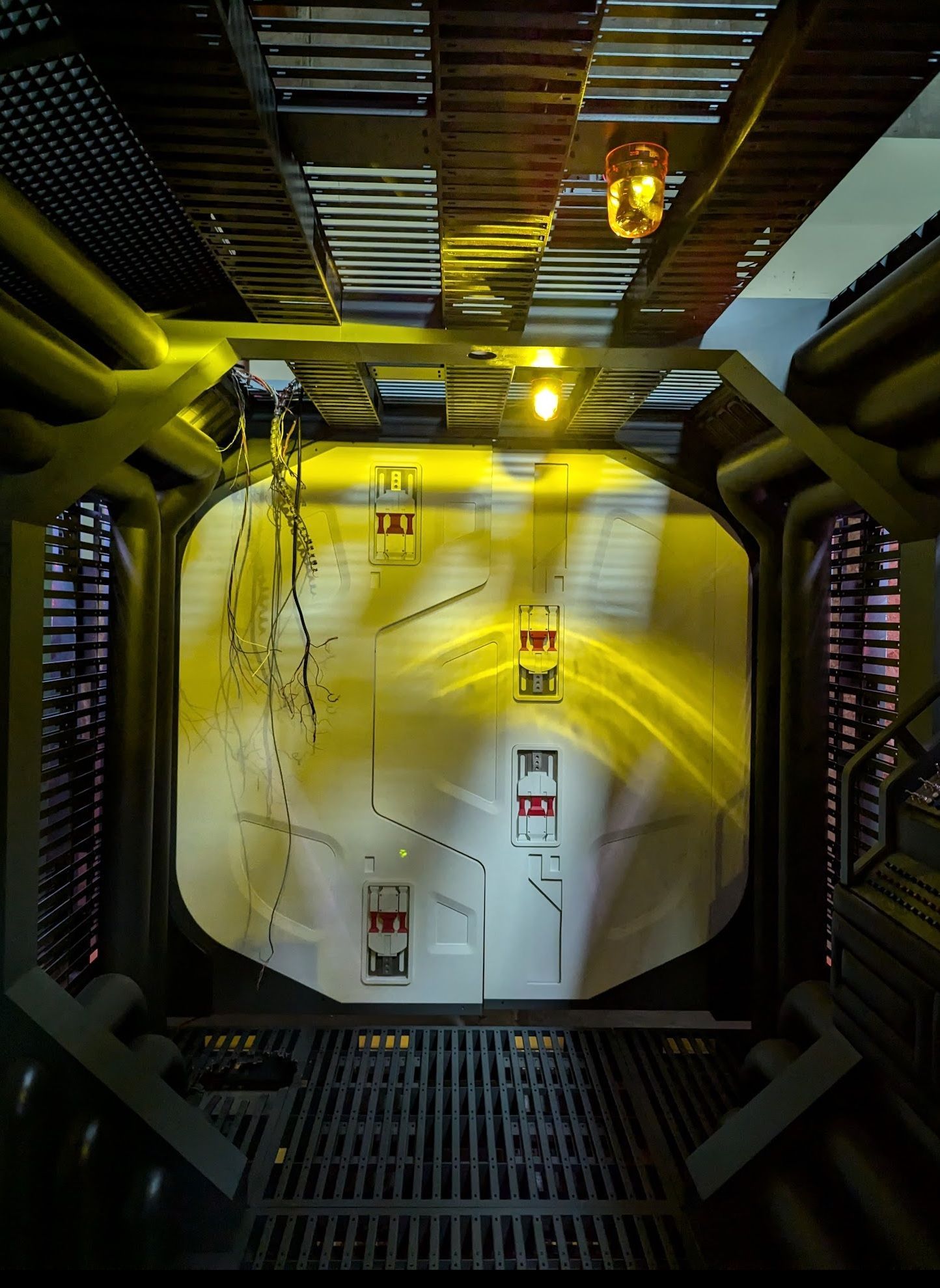 Back in the corridor, the Airlock door was basically done, and ready for weathering. Although after this, when we did start weathering, we tried it on these white doors, and didn't really like it, eventually opting to keep them less weathered than the rest of the corridor. In the ceiling you can see the acid scarred hole, and its matching counterpart down below in the floor.