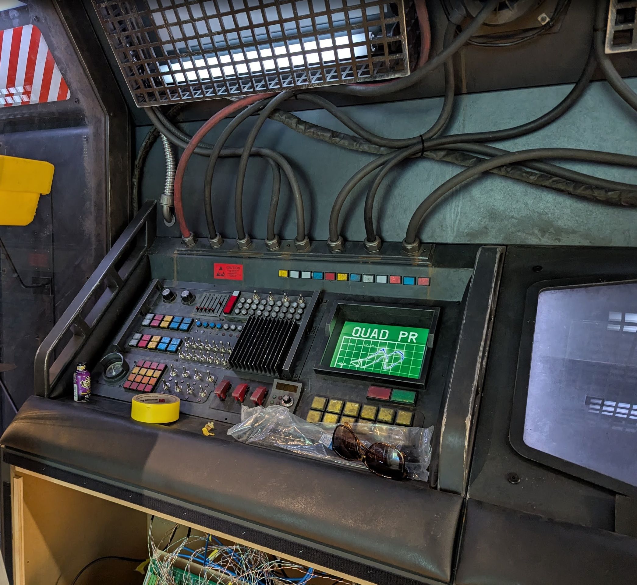 Wiring up the vestibule consoles & video screens. All the lights respond in some way to the buttons, switches & dials. Since we're talking about lighting, it's worth noting that when it's lit up brightly like this, it's because we have the service lights on, which are out-of-fiction lights hidden in the corridor for when we need plenty of light to work by. In this particular photo, we also have the in-fiction vestibule lights on as well.