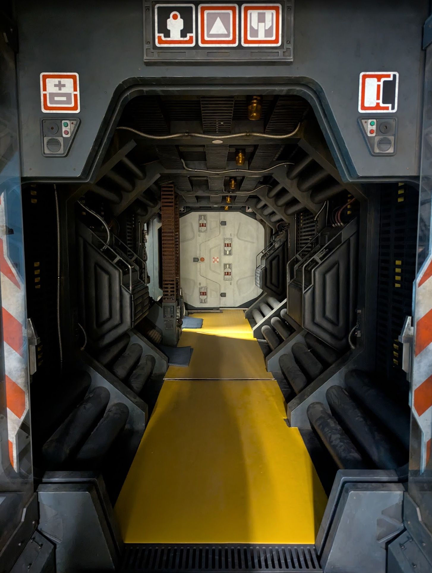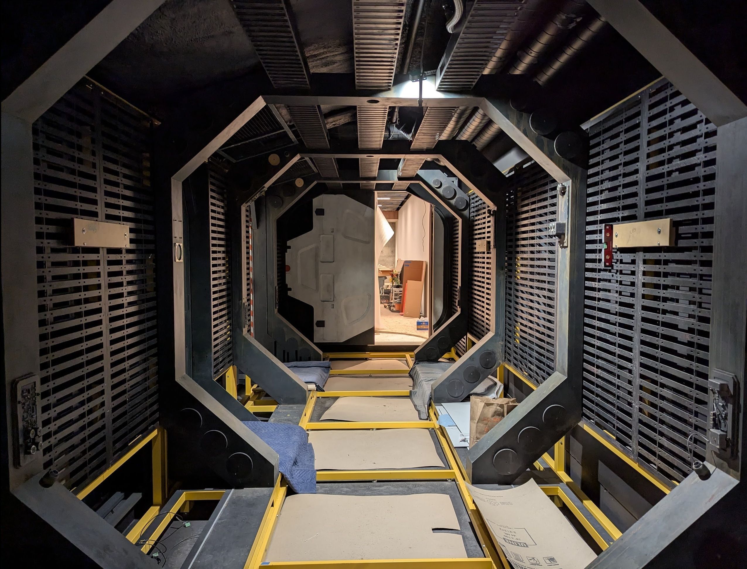 To answer your questions, it's a permanent fixture inside a building, with no plans to relocate it elsewhere. It was specifically designed to fit into a somewhat weirdly shaped volume inside the building, underneath a sloped staircase that's above it. To be honest, during development I didn't really think about anyone wanting to visit it. In retrospect, that was probably a mistake, especially now that it has a couple of props from the movie in it. I hate the idea of people not being able to see those. So I'm going to think a bit about ways to solve that.
