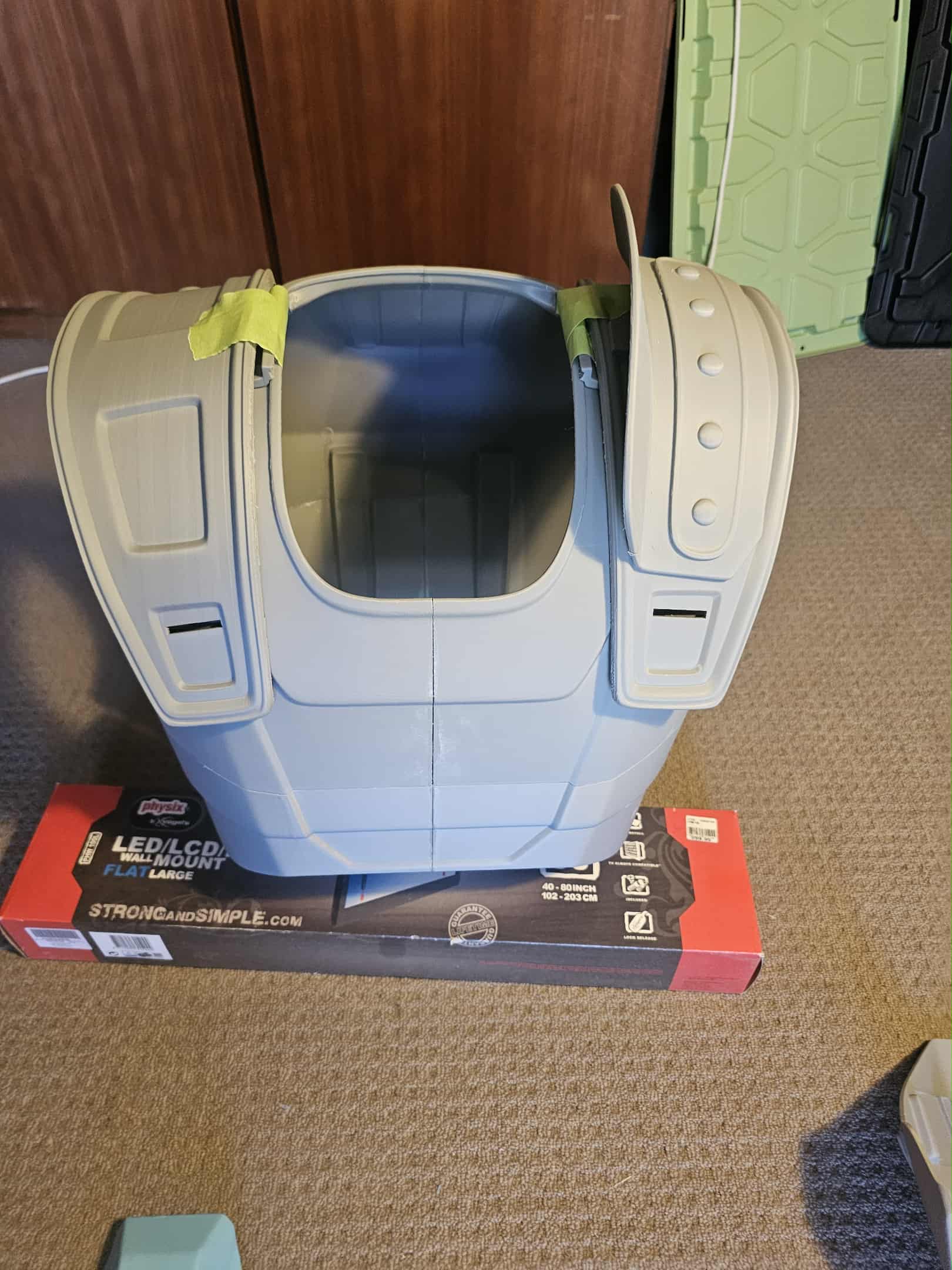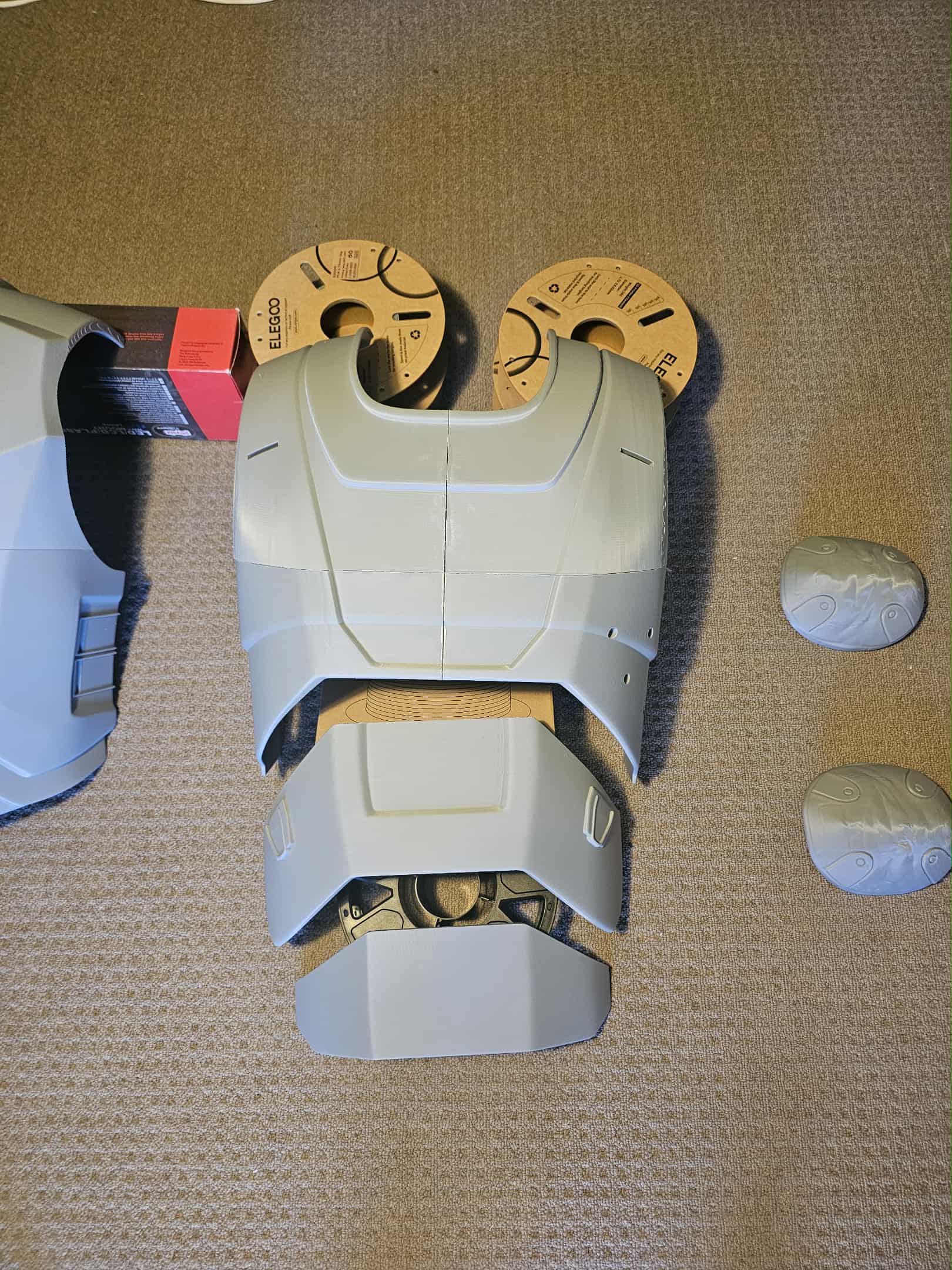 the shoulder lamp and greebles for the chest plate are still required prints. but the shoulder lamp is an extra that does not really need to be part of the final costume. in the coming months, bogging, sanding and final prep work will be done on the masters, then molding will begin. i will probably also sharpen the edging on the chest and abs V lines, re twirk the bicep guard to be a bit sharper at the base, ( bicep and Knees will be polyurethane rubber. and each piece of the shoulder sections on the chest and back plate will be cut to wearers specs, with piano hinges attached to create the clam shell effect while keeping the joins flush.