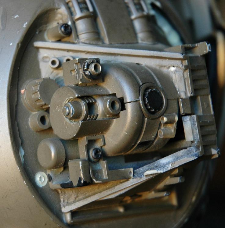 I can't decide if they actually cut a complete circle out of the side of the helmet., The part with the "piping" coming down looks almost to be part of the original helmet. Also the circle doesnt look like it would meet up if it continued round if you know what I mean but this could just be the angle. It would also of course explain why this piece does not appear to have moved at all like the rest of the plate the greeblies are on.