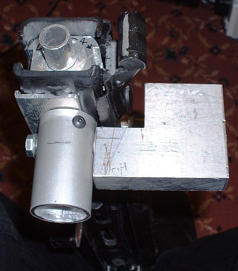 L shaped block cut from 20mm thick ally made and tapped to receive an 8mm bolt which goes thru the pivot cylinder - this will allow the gun to pivot up and down.
