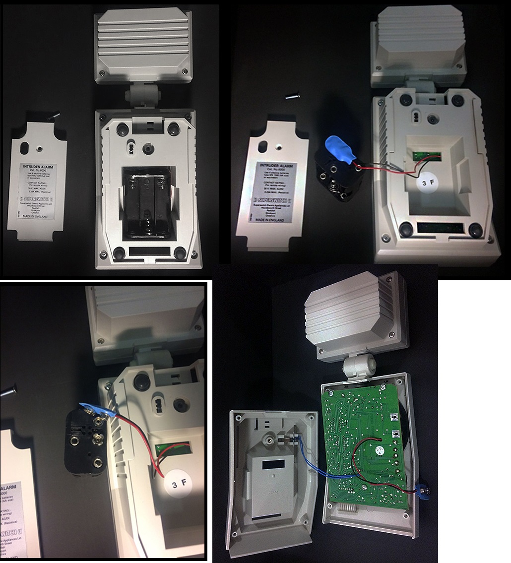 Alarm, Wall mount bracket in place, Removed, battery compartment