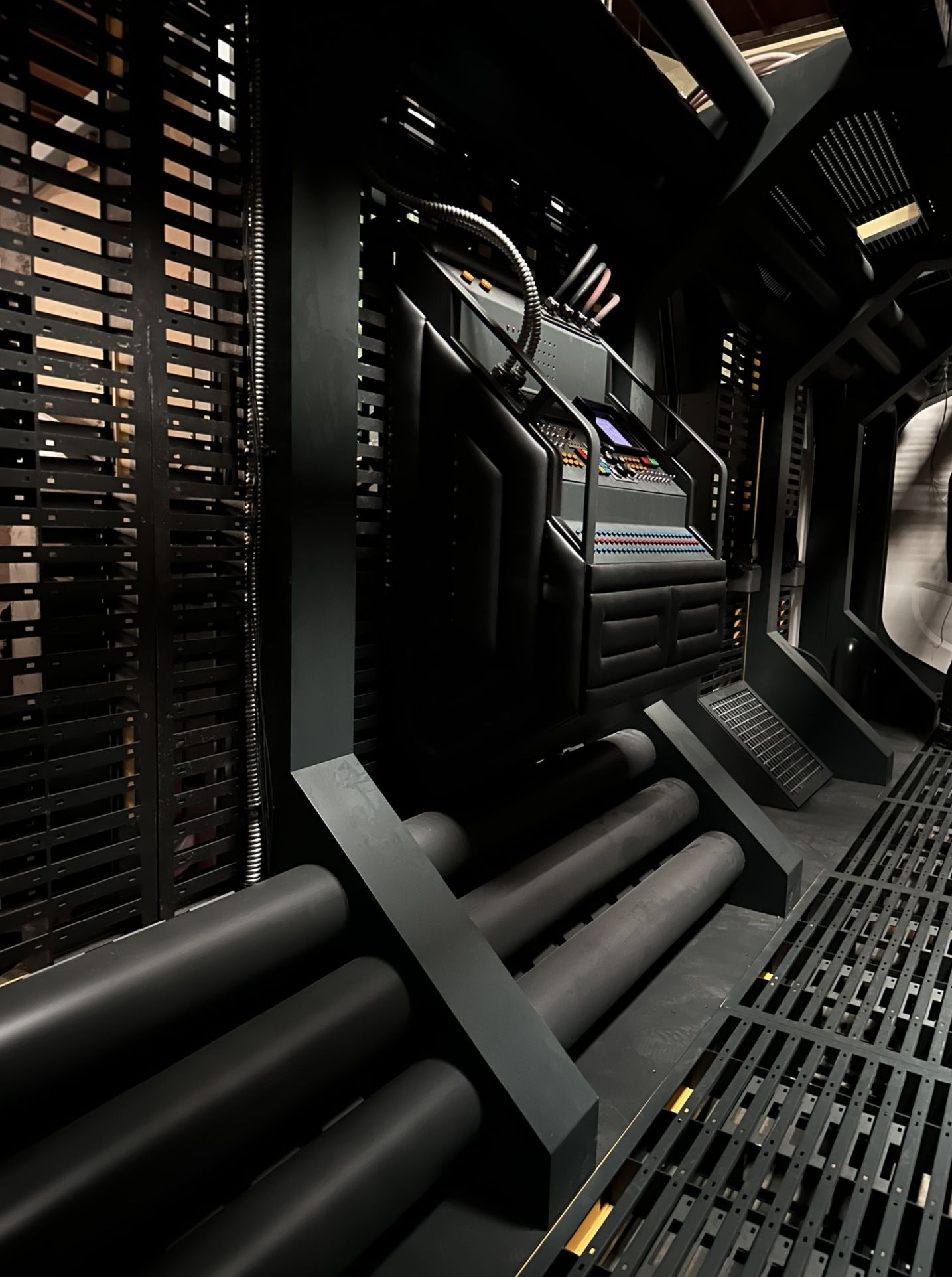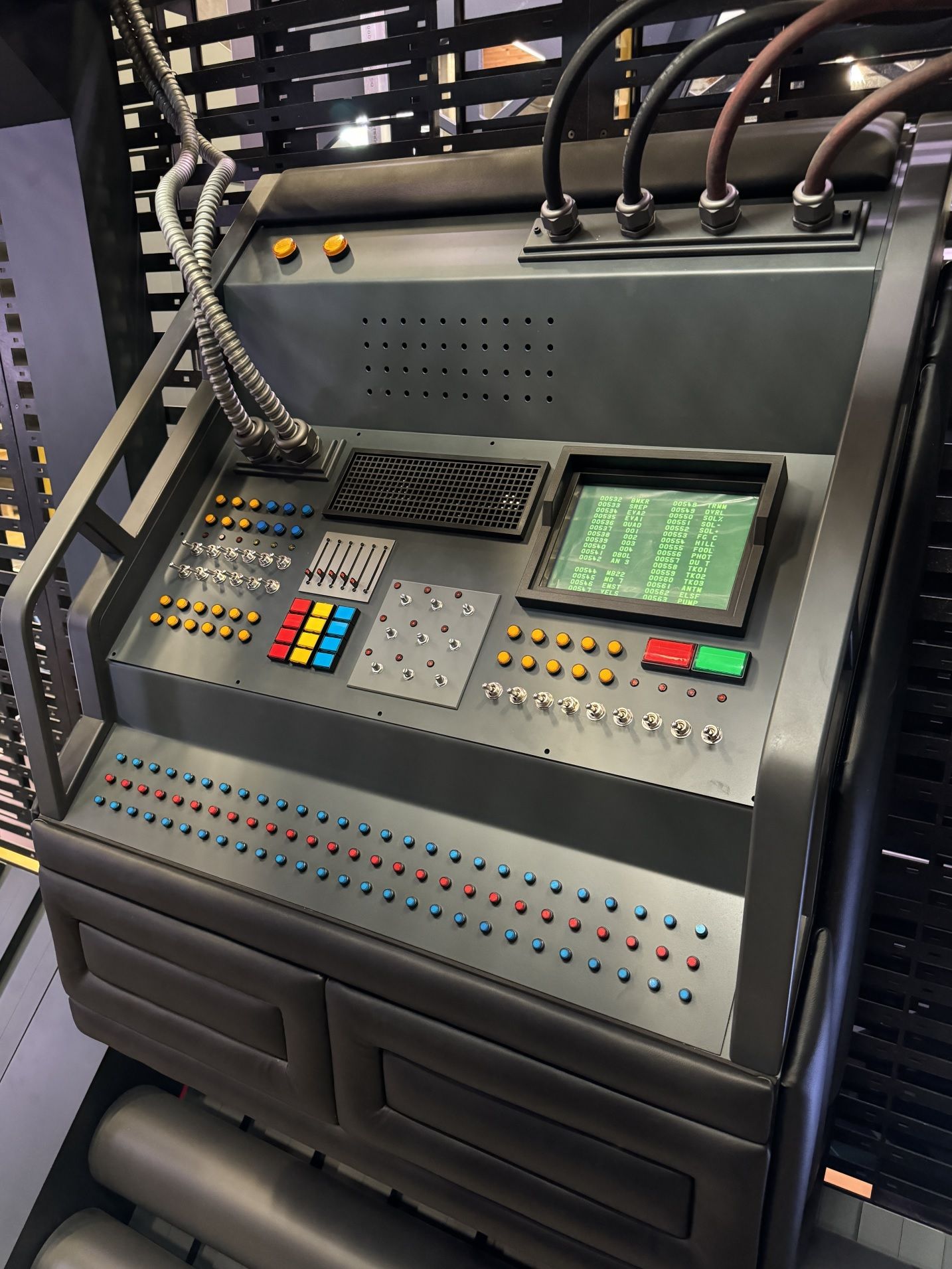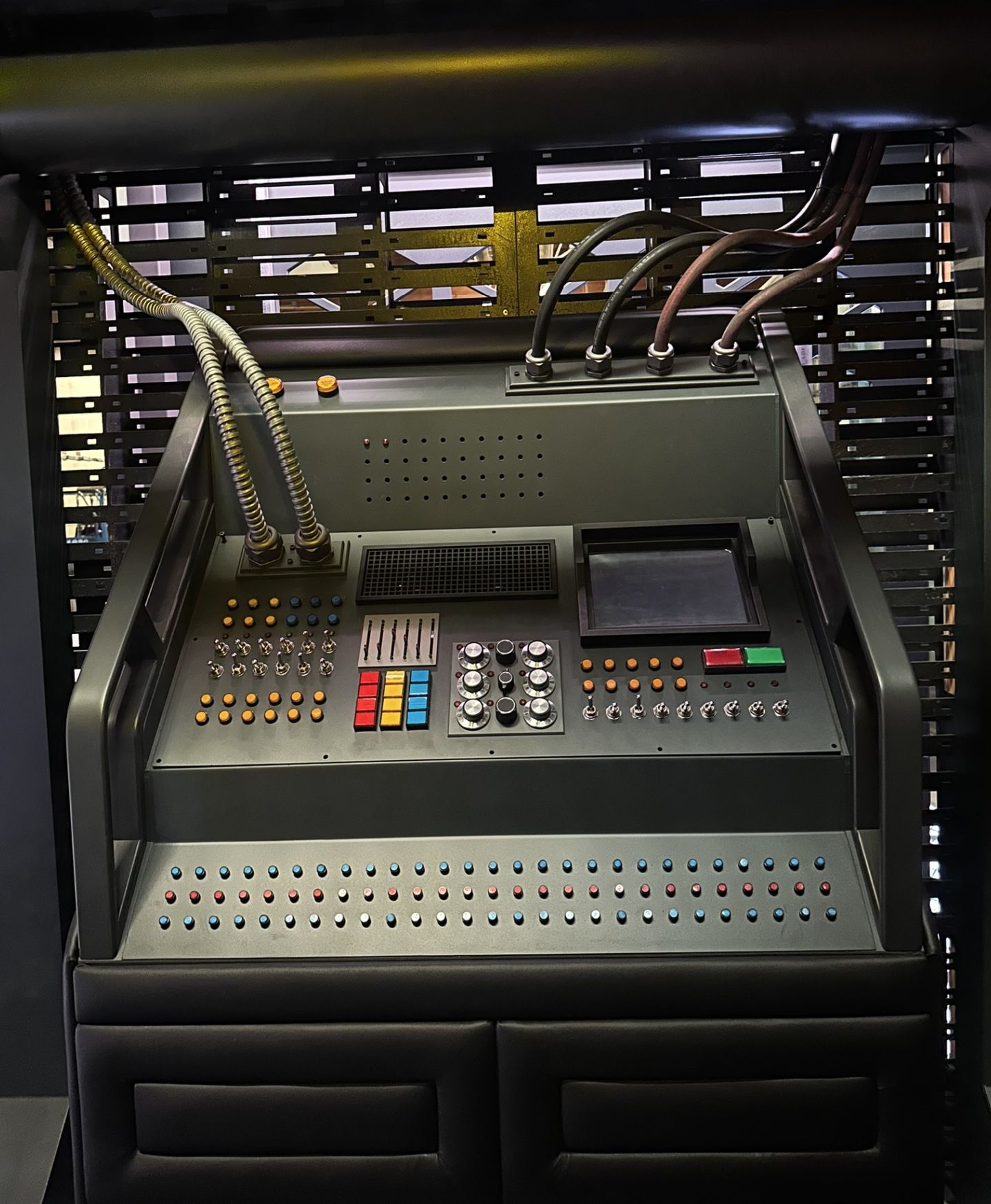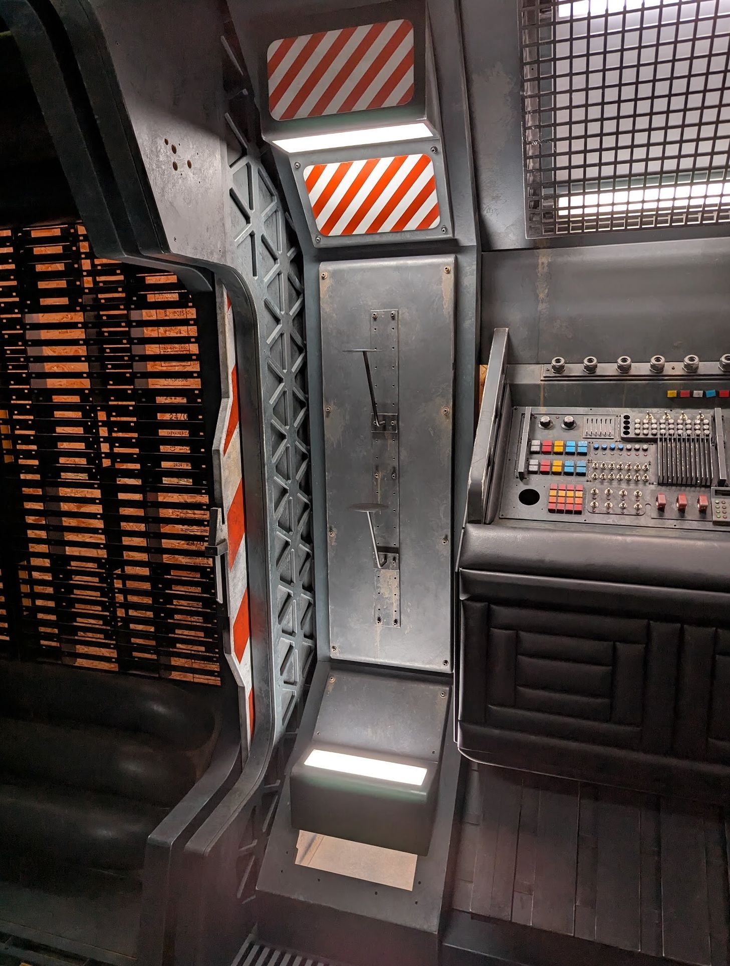 Another shot at the bridge window, but the reflection of the undergrate lighting behind me was more visible than it was in person. But this was the best photo I took of the flight console detail at the time, with what felt like the appropriate videos running on it.