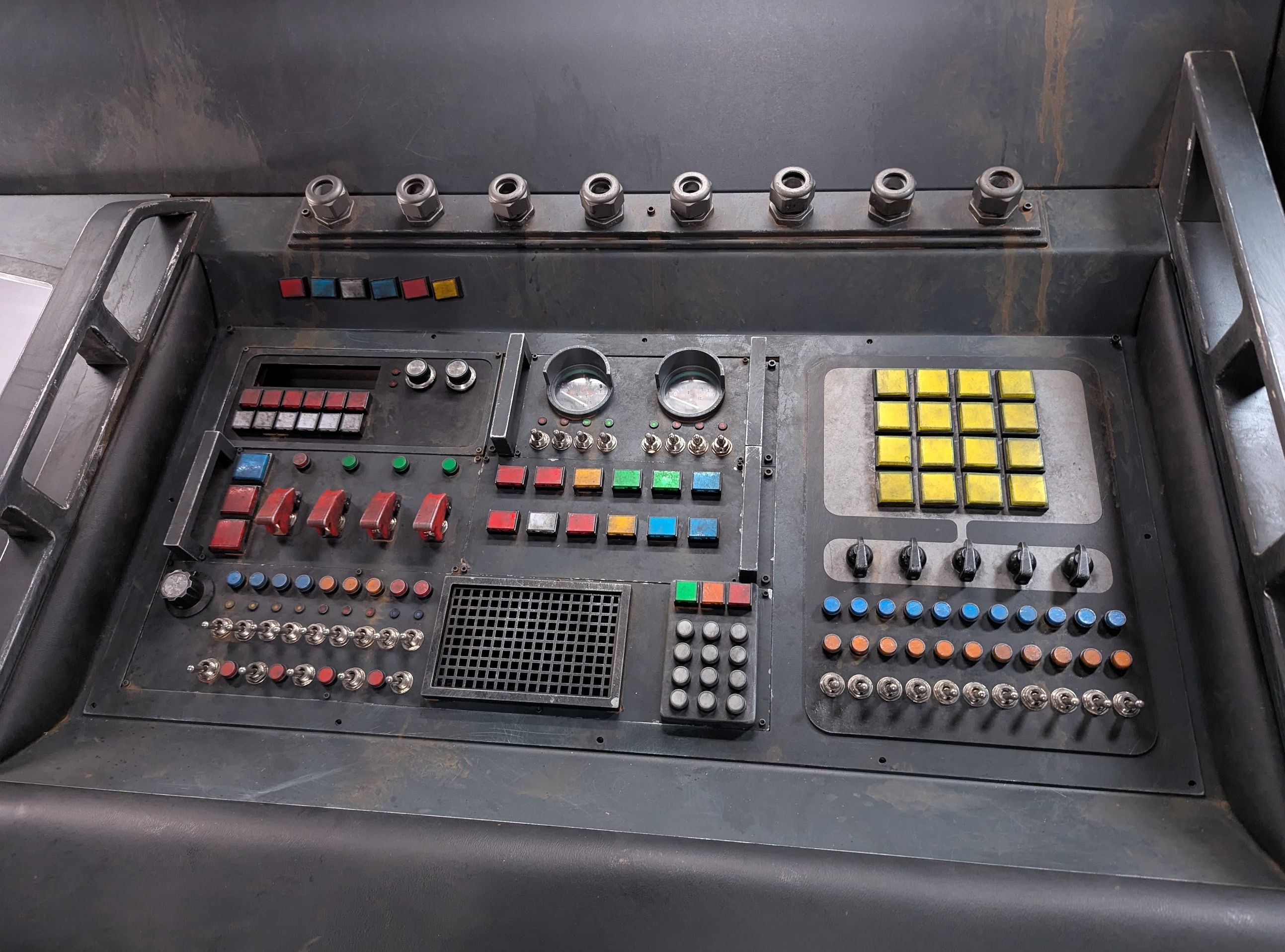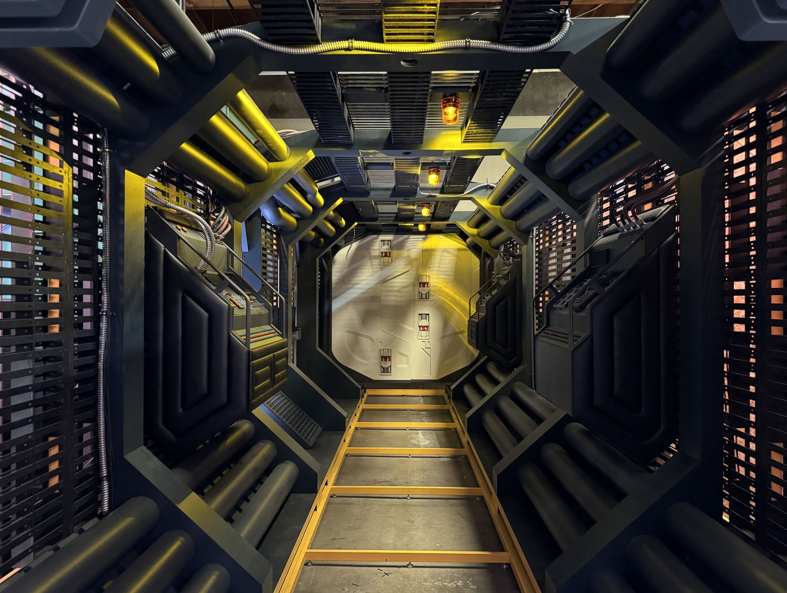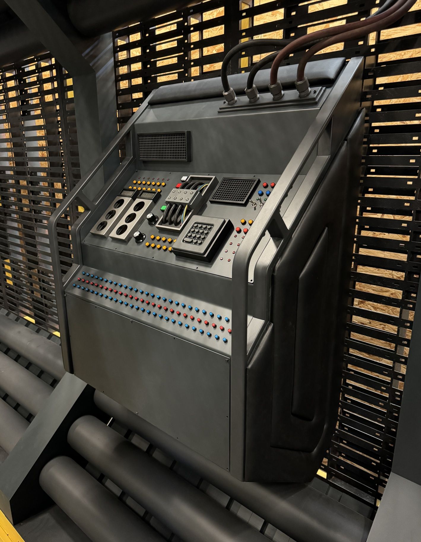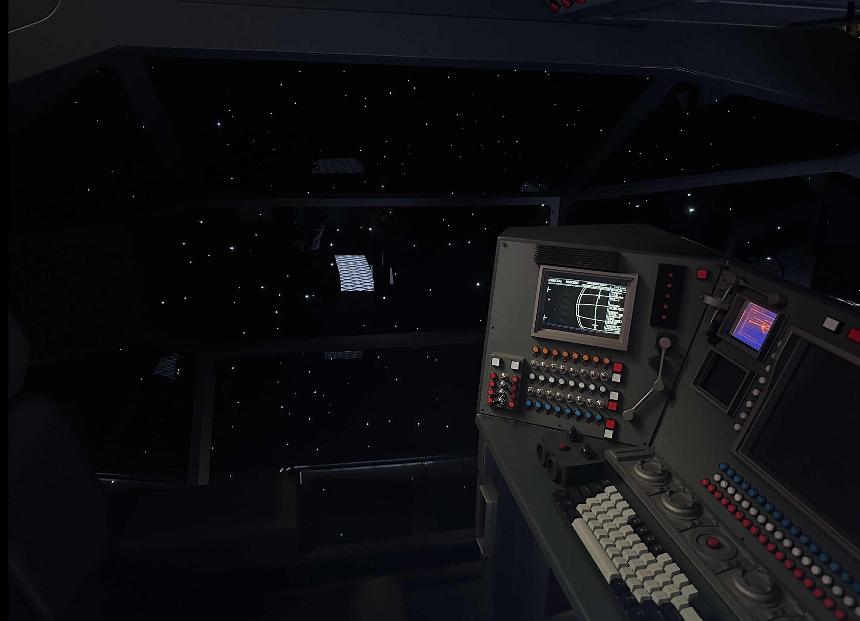 Another shot at the bridge window, but the reflection of the undergrate lighting behind me was more visible than it was in person. But this was the best photo I took of the flight console detail at the time, with what felt like the appropriate videos running on it.