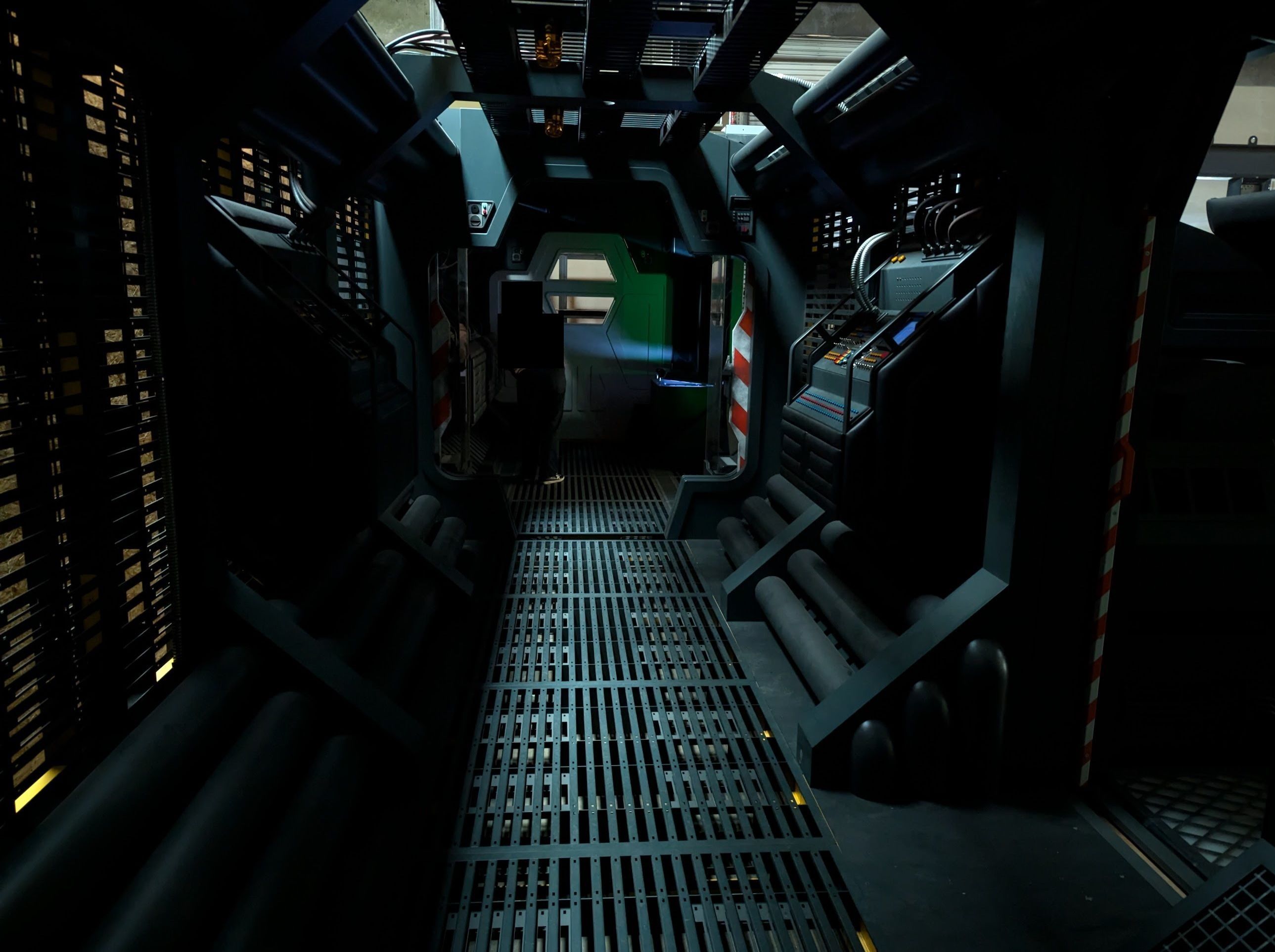 Back in the corridor, the Airlock door was basically done, and ready for weathering. Although after this, when we did start weathering, we tried it on these white doors, and didn't really like it, eventually opting to keep them less weathered than the rest of the corridor. In the ceiling you can see the acid scarred hole, and its matching counterpart down below in the floor.
