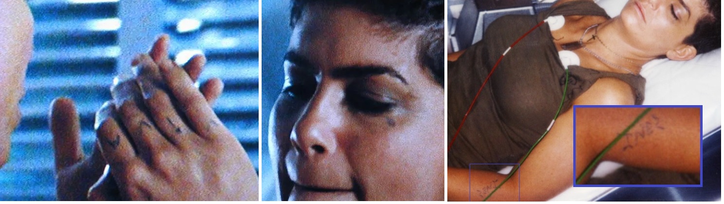 -Tattoo of some type on left forearm (indecipherable, potentially real and not costume decision)