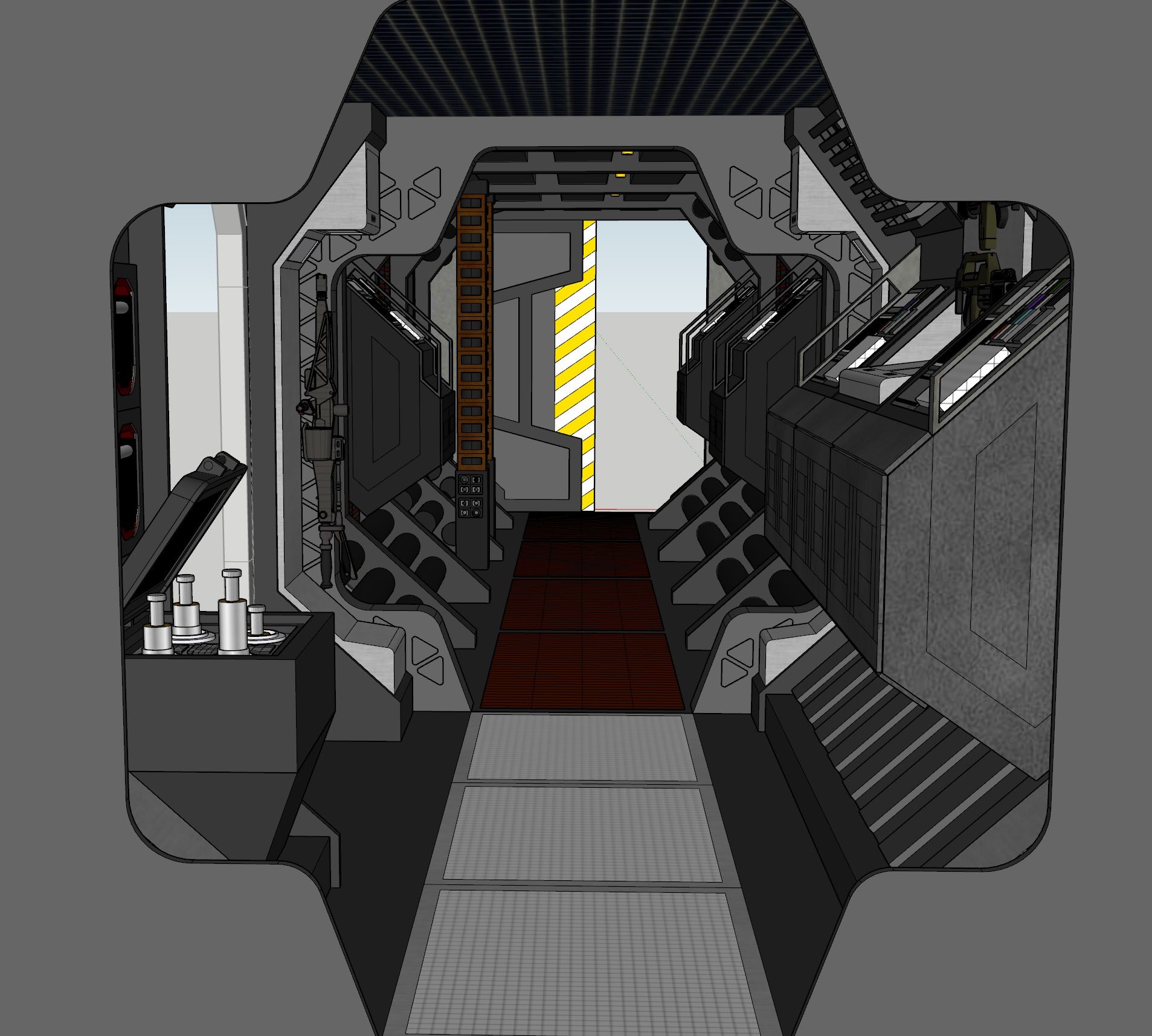 My other concern was the design. There's a physical volume the corridor had to fit into, which meant I couldn't just replicate some part of the Nostromo exactly. Even if I could, my favorite bits of the Nostromo aren't all in one part of the ship. I love the engineering deck, but it has a lot of non-sensical random greebles everywhere. It also doesn't have the iconic door shapes that everyone can recognize. So I decided the right approach was probably to design a corridor that evoked the Nostromo, playing on the iconic shapes we all know, while not trying to slavishly match any particular part of the set.
