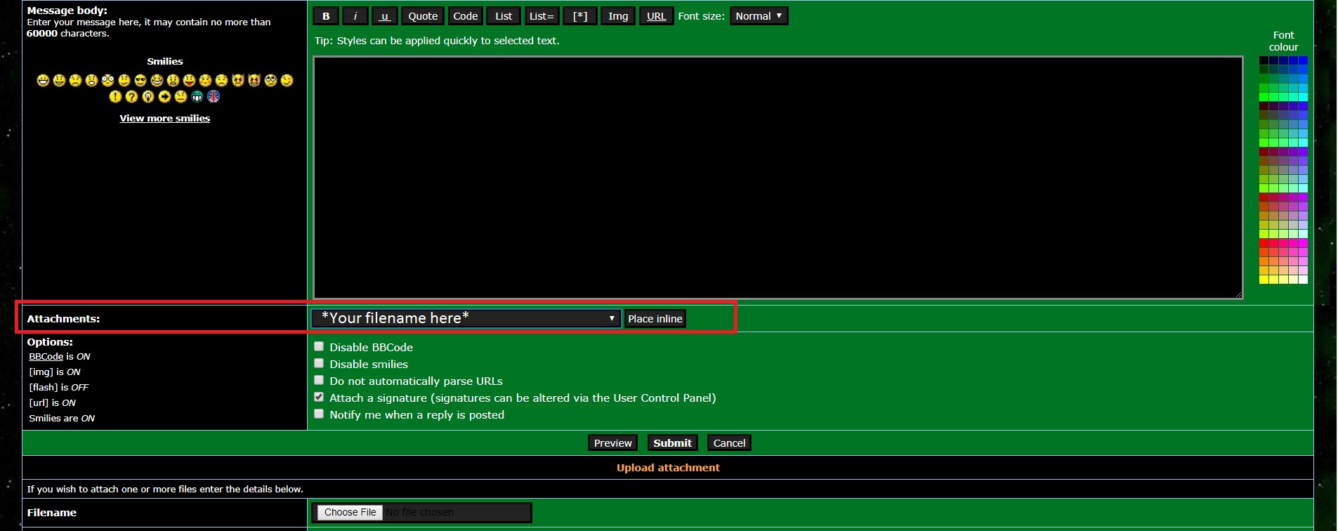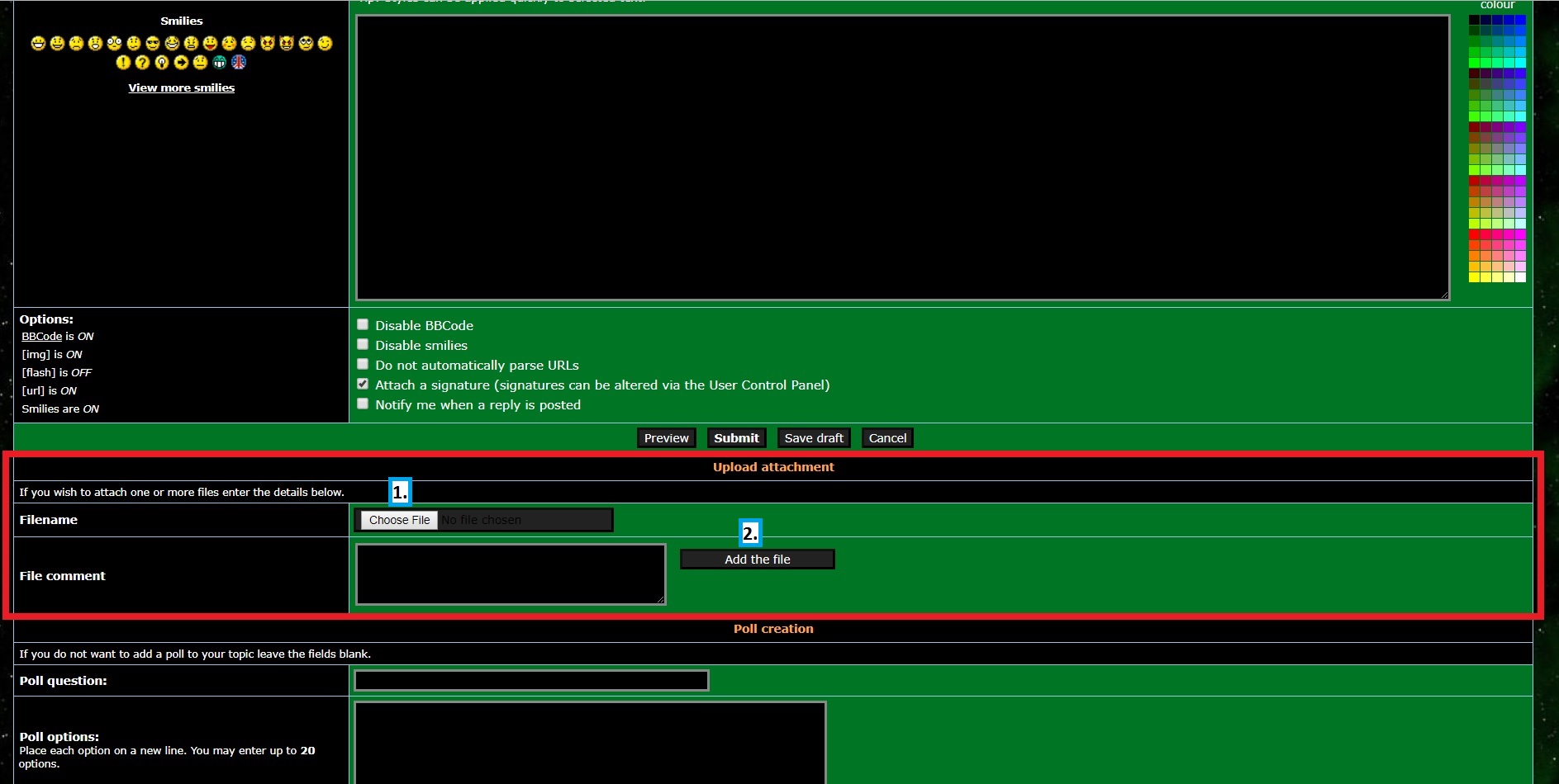 Note: Currently you can only upload 5 files under 2mb each to each post or private message. Follow these steps for each file as you can only add one file at a time. Most ".jpeg" files tend to stay within the maximum 2mb file size limit, so if you have large photos, use ".jpeg" files over ".png" files. You can see your attachments in the "Posted attachments" field below the "Upload attachment" field.