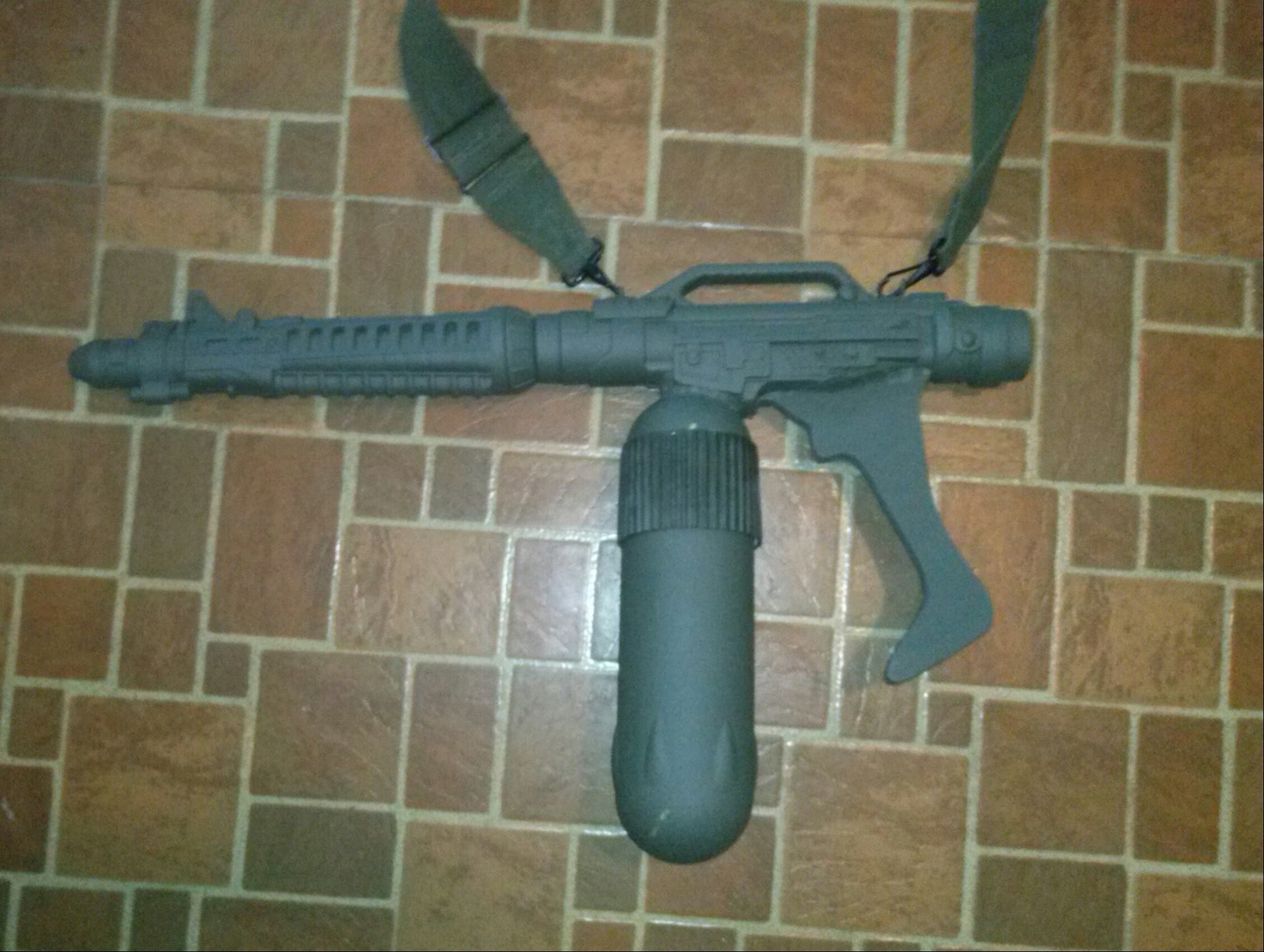 I still need to finish the top, add a second section of ribbing to the fuel tank, a trigger, and then paint the black bits black. All in all this has cost me less than $20 and hardly weighs anything. I'm really hoping I can get me son to a Con next year for the 30th all kitted out and armed with this!