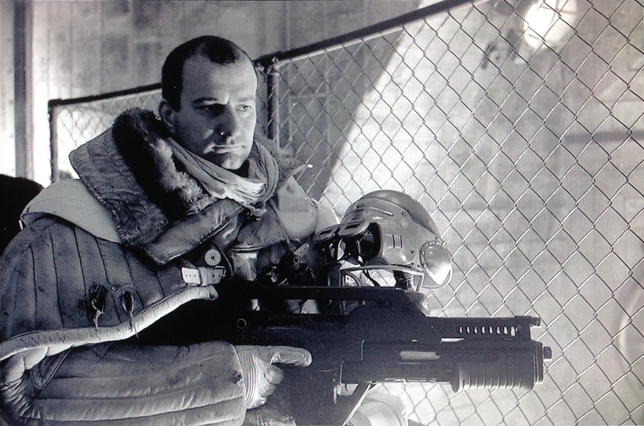 Latest observation....this actor and helmet looks to be the "Animal" character. If you looks closely at the right side of the dome, you'll see one of the arrows. It looks like he is also holding the hero pulse rifle and is the person who fired at 'Morse's" leg in the film.