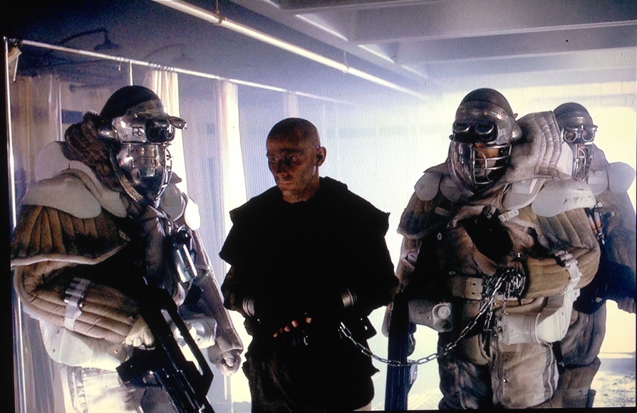 A full head mask of reinforced aluminium and g.r.p. with neckguard, hinged tinted goggles, noseguard and grilled mouth and chin area with three vents on one side, the back of the head applied with three red paper stars and inscribed in black felt pen Cruncher and inscribed on the inside G.S.; and a padded ski-jacket of white nylon, the zipped hood lined with white imitation fur, applied under the arms with reinforced plastic, both arms with two reflective grey stripes, the right arm applied with a circular white patch embroidered with a design incorporating a silver W - both made for the 1993 Twentieth Century Fox film Alien 3"