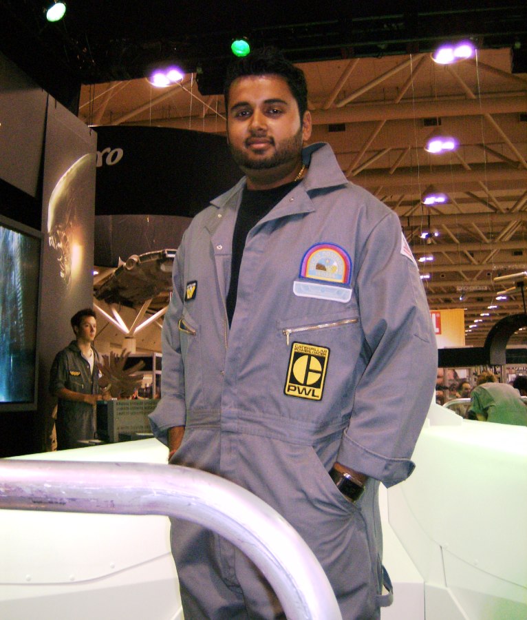 And here is their example of a Weyland-Yutani... uhh... Nostromo... uhh... guy in a jumpsuit with a bunch of Aliens related patches working at the Fox booth: