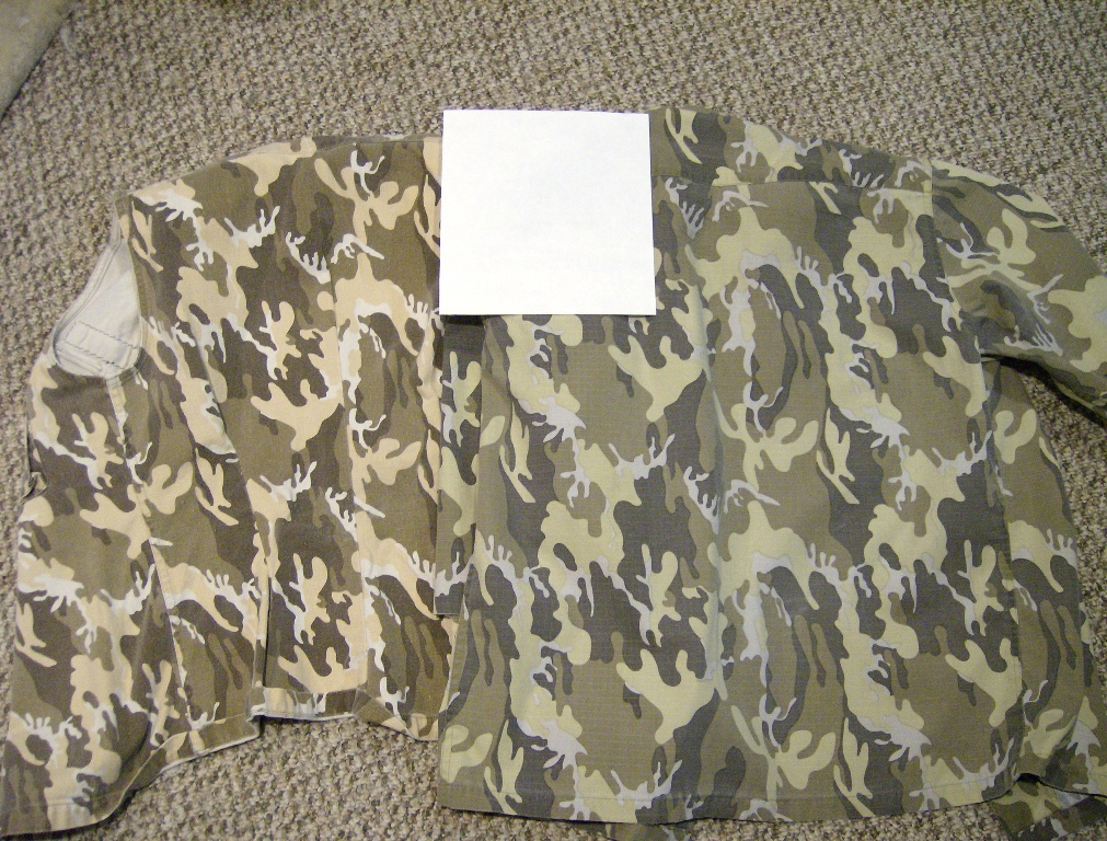 As you can see the 1PAT is much more brown. Also if the pattern doesn't seem to line up properly with the 1PAT, it is because I added some pleats in the back to be a little more form fitting. Both tunics have gone through several washes and are well faded.