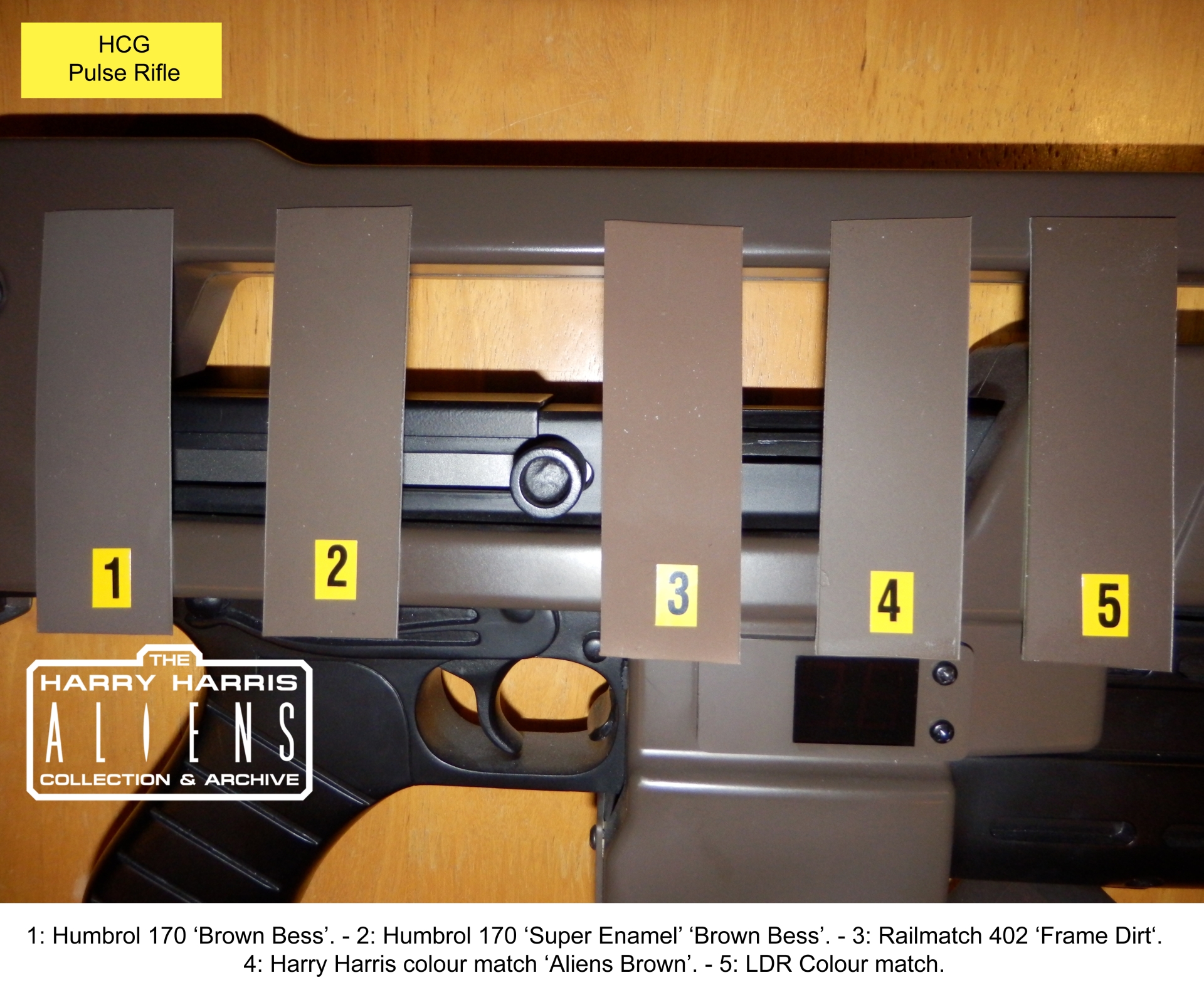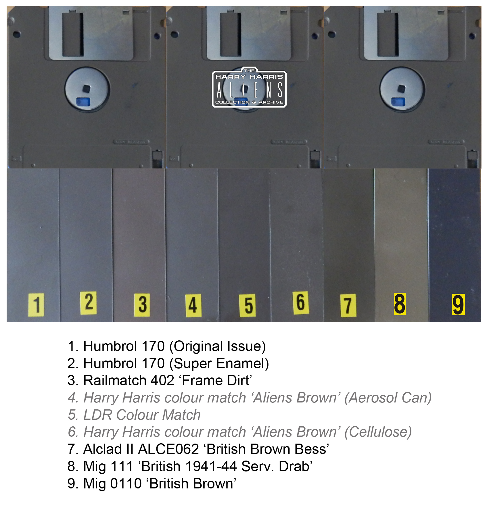 So I managed to get together a whole bunch of paint this week and make up some sample swatches. I photographed them together and next to two items from my collection that are from 'Aliens', and painted in 'Brown Bess'. Now of course every camera is different in terms of how it shows colours, as is every computer monitor or other display so the important thing indicated here is how these different paints look in comparison to one another, and to something from the film. To the naked eye the samples look VERY different to how they look in the photos.