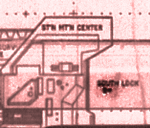 One thing though, there is a break in the guard rail somewhere along the East wall (opposite Ops and the Medlab) indicating a doorway. We see it to the left of Lydecker when he and Al walk down the hall after leaving Ops. I don't know how fa down it is, but not too far.