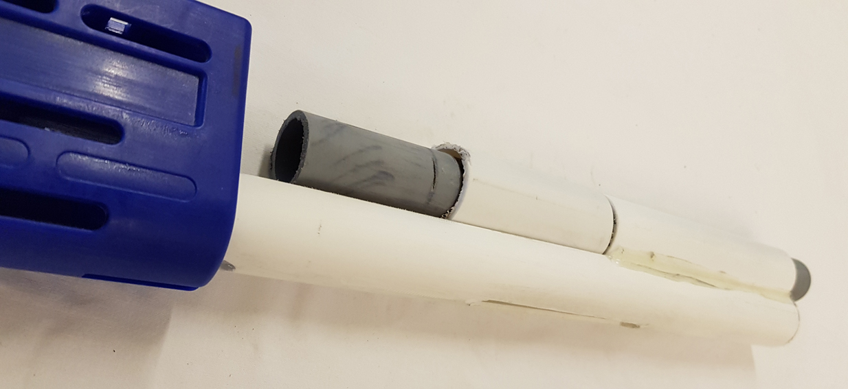 The launcher barrel sleeve and magazine tube are made from 34mm uPVC waste pipe. The top barrel sleeve is cut to length from the eject port to the end of the cage, and the mag tube the full length of the cage. To make them fit inside the cage the mag tube needs to have a strip cut out down its full length and then glued to the barrel sleeve (I used a hot glue gun for this).