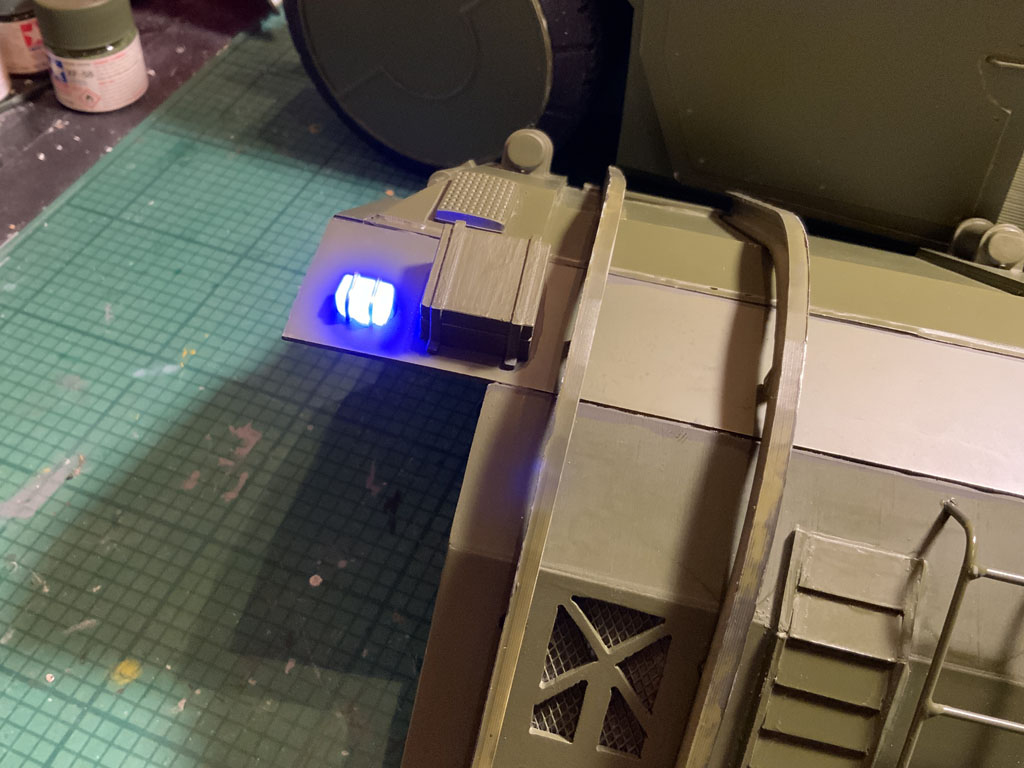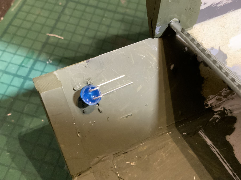 Of course they're blue in the movie, so my red LEDs got dug out and replaced with blue. I needed to shave them down on the dremel to get rid of the 'dome' top.