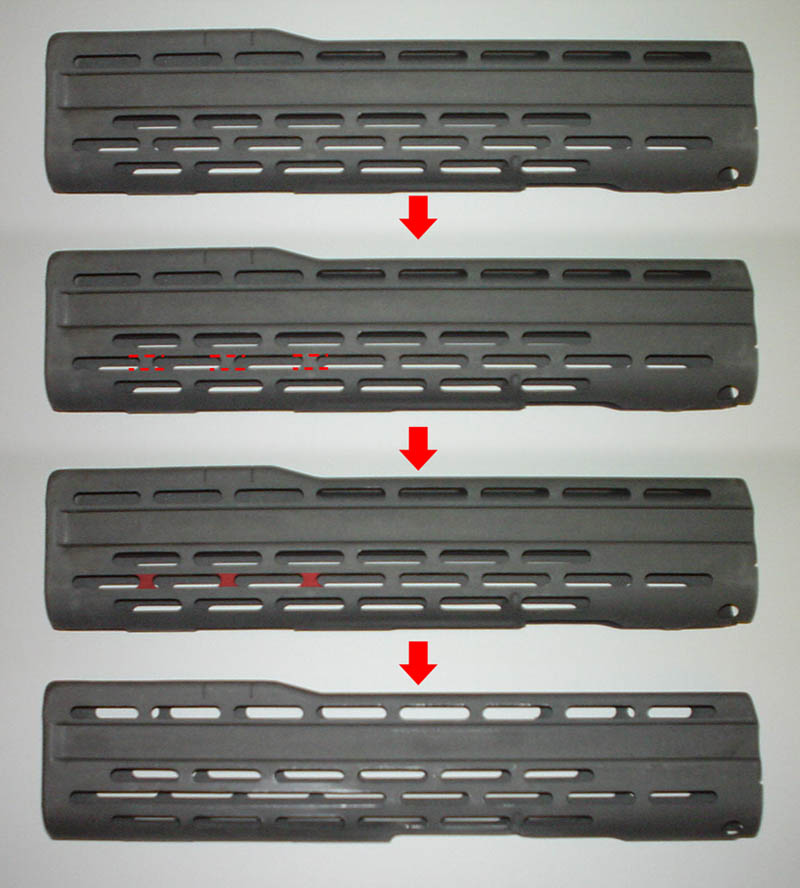 * Left side of the cage:On the left side of the cage you need to remove three small sections to allow the pump grip's racking mechanism access to the inside of the cage.